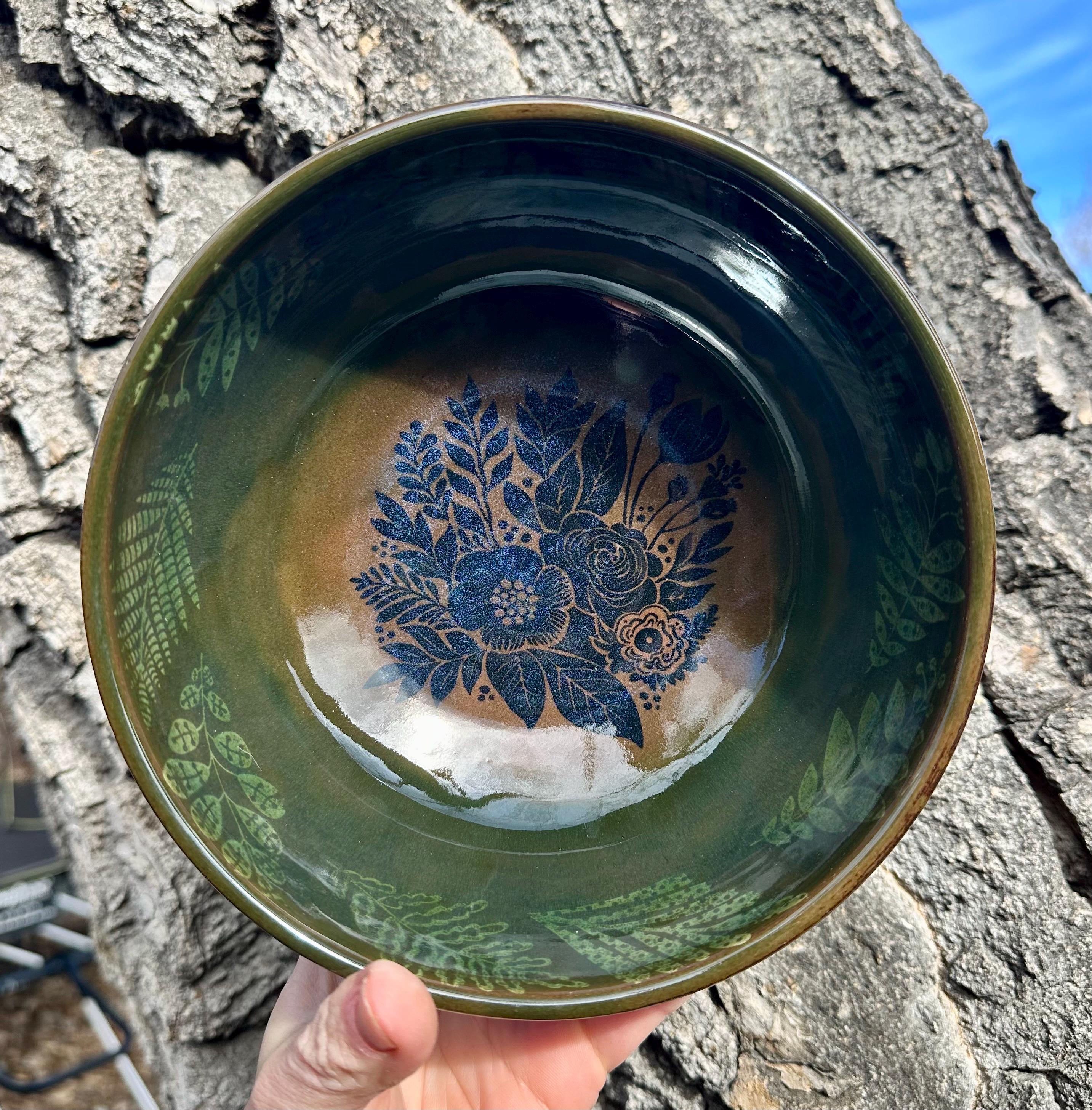 Medium/Large handmade pottery serving bowl over a rich dark clay decorated with a floral and fern design inside with a deep emerald green translucent glaze and a green on the outside. This bowl is perfect for fruit, dinner party serving, or a nice big salad. Measurements are as pictured. You can zoom in for details, glaze pattern, etc. Let me know if you need help reading the measurements or have any questions whatsoever, happy to help.